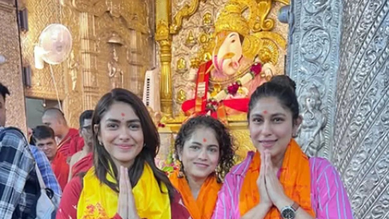 Actress Mrunal Thakur took Bappa`s blessings during her visit to Pune. The Jersey actress offered prayers at the Shreemant Dagdusheth Halwai Ganpati Mandir on Tuesday, the glimpses of which have also been published on her official social media handle.